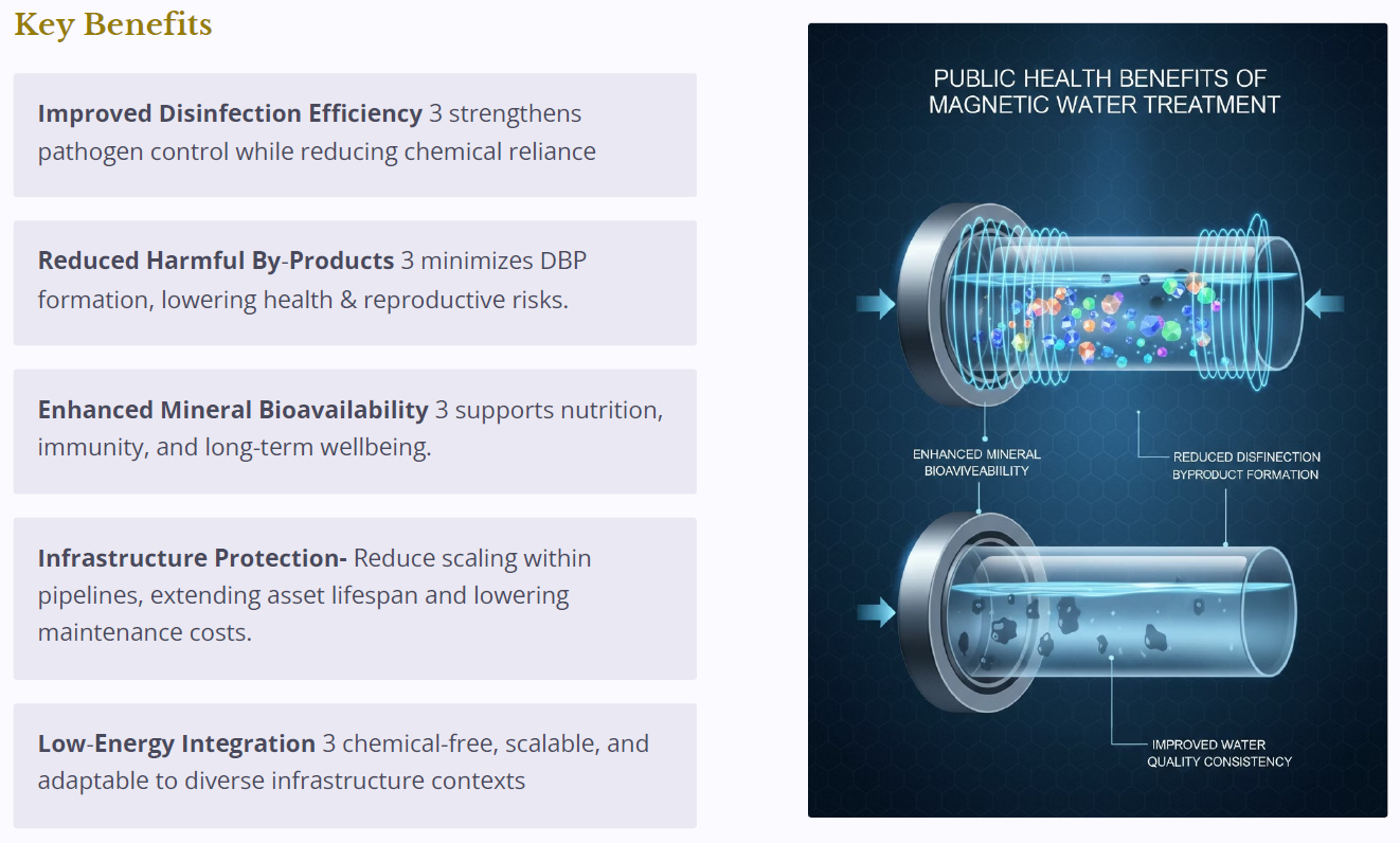 Forpublic healthauthorities, water boards, municipal planners, and development agencies seeking high-impact, low-input interventions, Magnetic Water Treatment offers a powerful opportunity to enhance water safety, improve public health outcomes, and extend infrastructure life 4 all through a single, cost-effective integration.