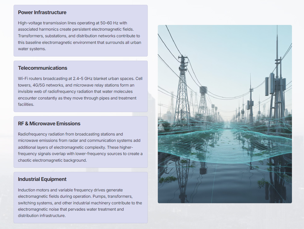 Cities and industrial zones generate a complex, overlapping spectrum of electromagnetic frequencies that permeate the environment. Water moving through treatment plants, pipelines, and buildings encounters this electromagnetic noise continually, potentially disrupting its natural resonant properties.